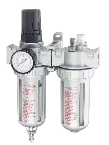 This new combo unit is great for controlling air pressure, trapping moisture and cleaning air in pneumatic systems. 150 PSI maximum pressure. Locking control knob and an easy to read pressure gauge make pressure adjustments a snap. Includes a micro-fog lubricator and a handy wall mounting bracket. Accepts 1/4" NPT fittings.You will not be disappointed with